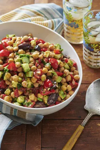 In a large bowl, combine ¼ cup olive oil, the juice of 1 lemon, 2 tablespoons red wine or sherry vinegar, 1 tablespoon honey, ½ teaspoon hot sauce, and salt and pepper to taste. Add 2 (15-ounce) cans chickpeas (drained and rinsed), ½ cup minced red onion, ½ cup crumbled or diced feta (optional), ¼ cup halved black olives, 2 cups halved cherry or grape tomatoes, ½ cup diced grilled or roasted pepper (you can also use jarred), 2 cups diced cucumber, and ½ cup minced fresh parsley. Fold in 2 diced avocados.