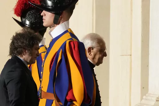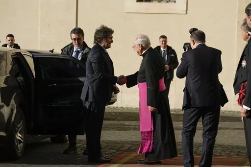 The Vatican said the two men met for an hour and 10 minutes, an unusually long audience by Francis’ standards, especially given no translation was required. Vatican video showed a smiling Francis briefly grasping Milei's arm for support as they walked to his desk at the start of their meeting.