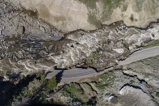 In the town of Gardiner, a driveway curved past a small house and appeared to drop off at the edge of the eroded bank of the Yellowstone River that sparkled silver in the sun. Until early Monday evening, it had led to a large house that was home to six park employees and their families. They had evacuated before it toppled into the roiling rapids and was carried 5 miles (8 kilometers) downstream before sinking.