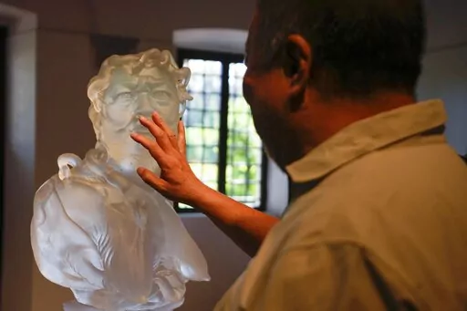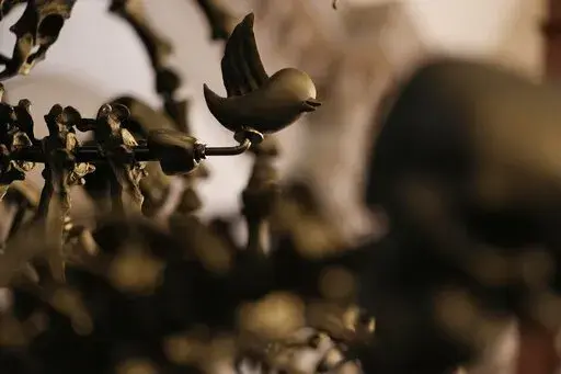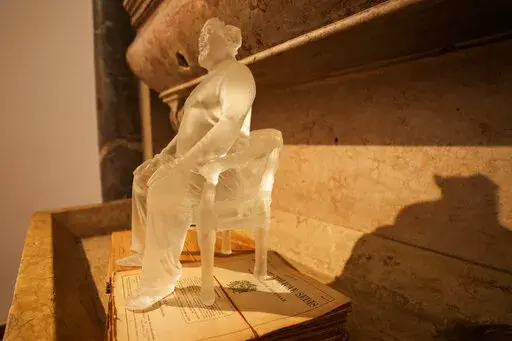 The exhibit also features smaller glass sculptures. One depicts Ai himself as a prisoner. Another imposes his distorted face on a replica of an 18th-century statue titled “Allegory of Envy.″ A wooden sculpture of a tree trunk fills a sacristy. Colored glass hard hats save places in the choir. Lego-brick portrait replicas of famous paintings and the Chinese zodiac line the church's walls.