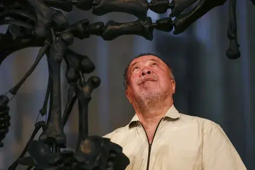 He stands by his 9-meter (29.5-foot), nearly 3-ton black glass sculpture, which is suspended over the central nave of the deconsecrated church of San Giorgio Maggiore, located opposite Venice's St. Mark’s Square. Titled “The Human Comedy: Memento Mori,” the sculpture is the centerpiece of an Ai exhibit at the church that opens Sunday.