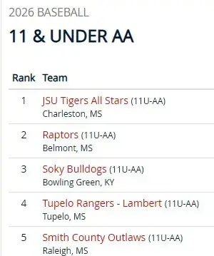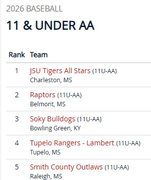 Eight of the 11 ranked teams in the 11 and under age division of Class AA are Mississippi squads. Two are from Georgia and one from Kentucky.