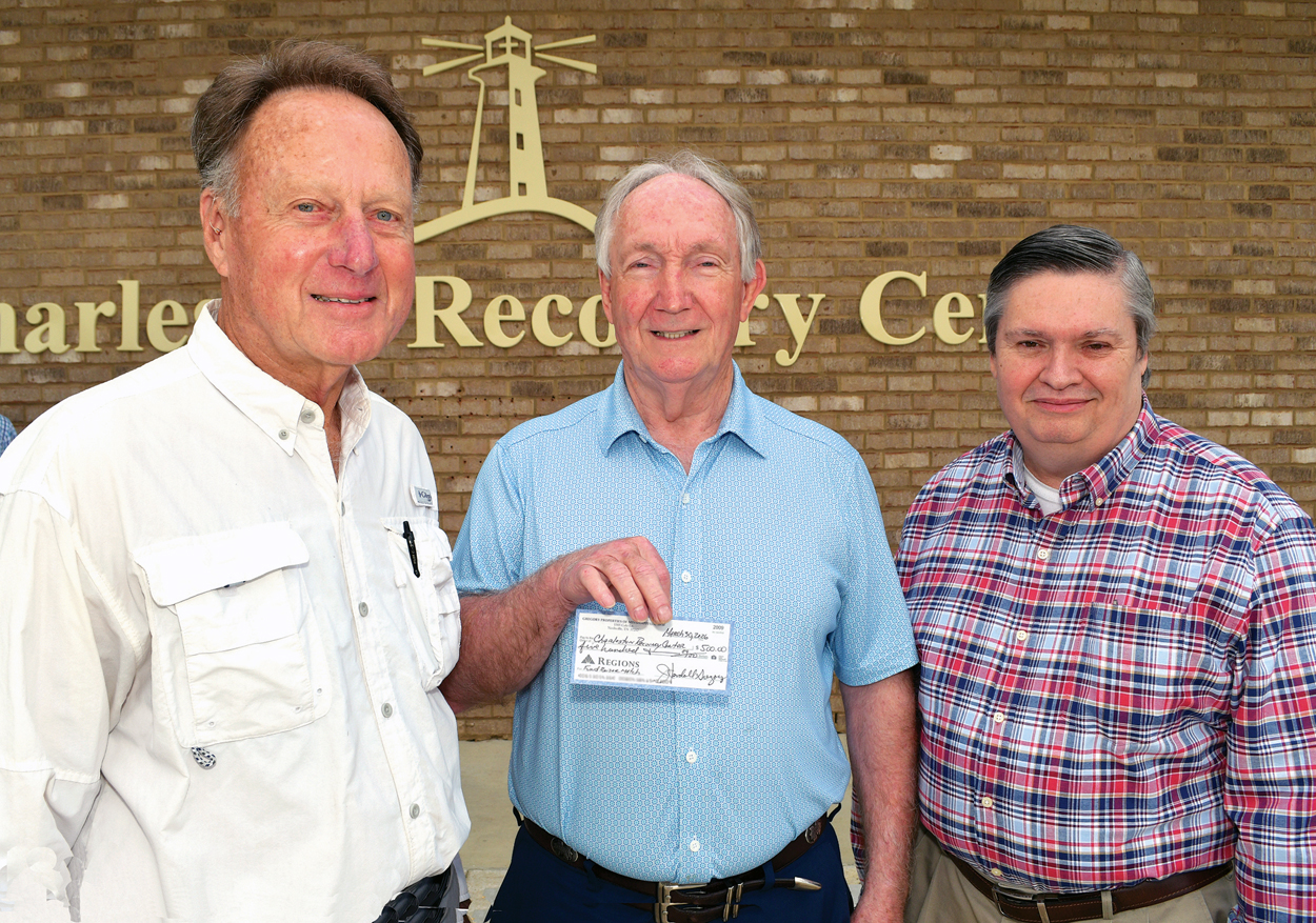 From left, Ken Gregory, Eddie Hargett and Ray Clolinger show the first donation, a check for $500, contributed to the ongoing Charleston Recovery Center semiannual fundraiser. (Photo by Clay McFerrin, Copyright 2026, Emmerich Newspapers Inc.)