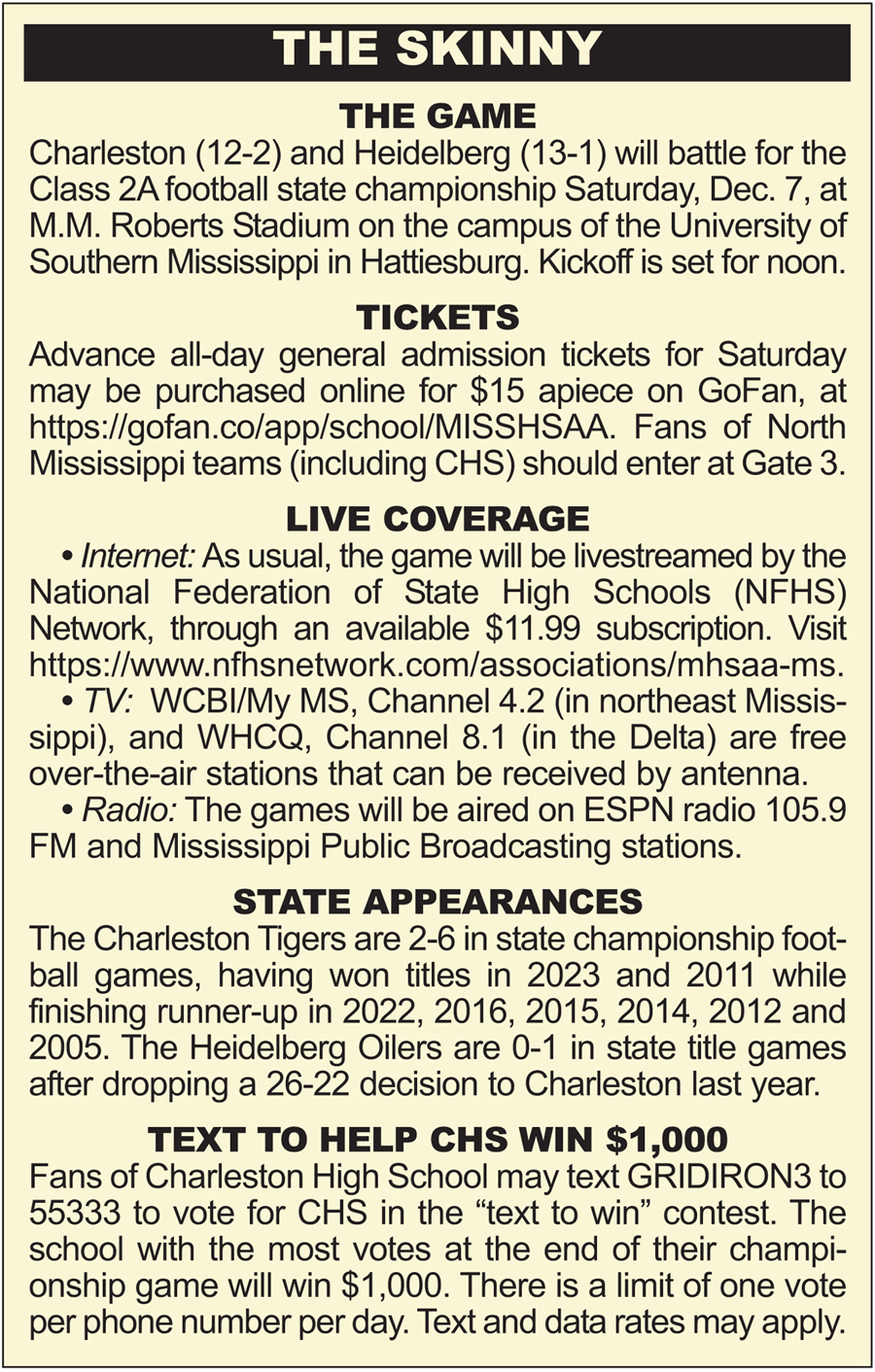 Another game that is of interest to many Tallahatchians is Saturday night's Class 6A title match between the 14-1 Grenada High School Chargers and the 13-0 Hattiesburg High School Tigers. A couple of former Charleston head coaches will be on opposing sidelines for the 7 p.m. kickoff.