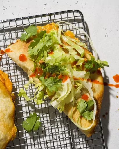 Since we don’t deep-fry them, there’s no need to roll the filled tortillas into tubes; spooning the filling over one half of a flour tortilla and folding it over will do. Cooked on a greased baking sheet in a 475°F oven, our tacos bake up golden and crispy — with all the flavor of L.A., but none of the hassle of deep-frying.