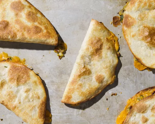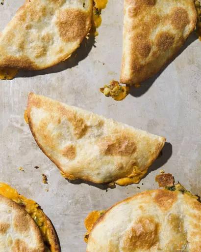 Divide the potato filling evenly among the tortillas (about a scant ¼ cup each) and spread it to cover half of each tortilla, then sprinkle with the cheese, dividing it evenly. Fold the unfilled sides over. Arrange the filled tortillas on the prepared baking sheet, then flip each one so both sides are coated with oil.