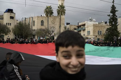 Instead of their traditional march through the streets of Bethlehem, young scouts stood silently with flags. A group of local students unfurled a massive Palestinian flag as they stood in silence.