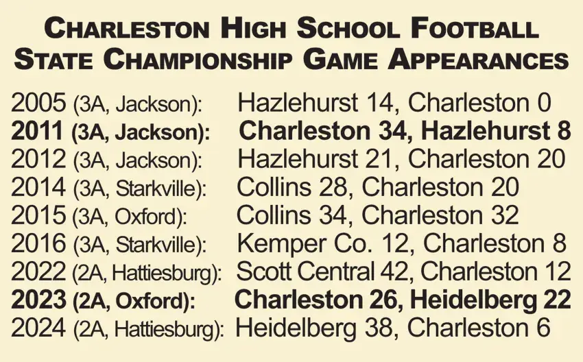 This time, Charleston (13-2) finished as the state runner-up to Heidelberg (14-1) in a game played at M.M. Roberts Stadium on the campus of the University of Southern Mississippi in Hattiesburg.