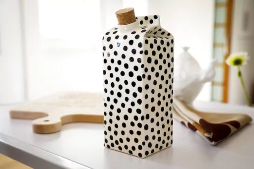 So would a nice hot dish, a standout pie dish, some biscotti or fancy tea, a set of tea towels. You can't go wrong there in capturing the mood. Etsy seller Claylicious sells a blue and gold ceramic egg tray for $87 offering just the ride touch. Another Etsy seller, ZLATNA porcelain, has a ceramic milk carton with a cork stopper in a white-and-black polka dot design for $109.