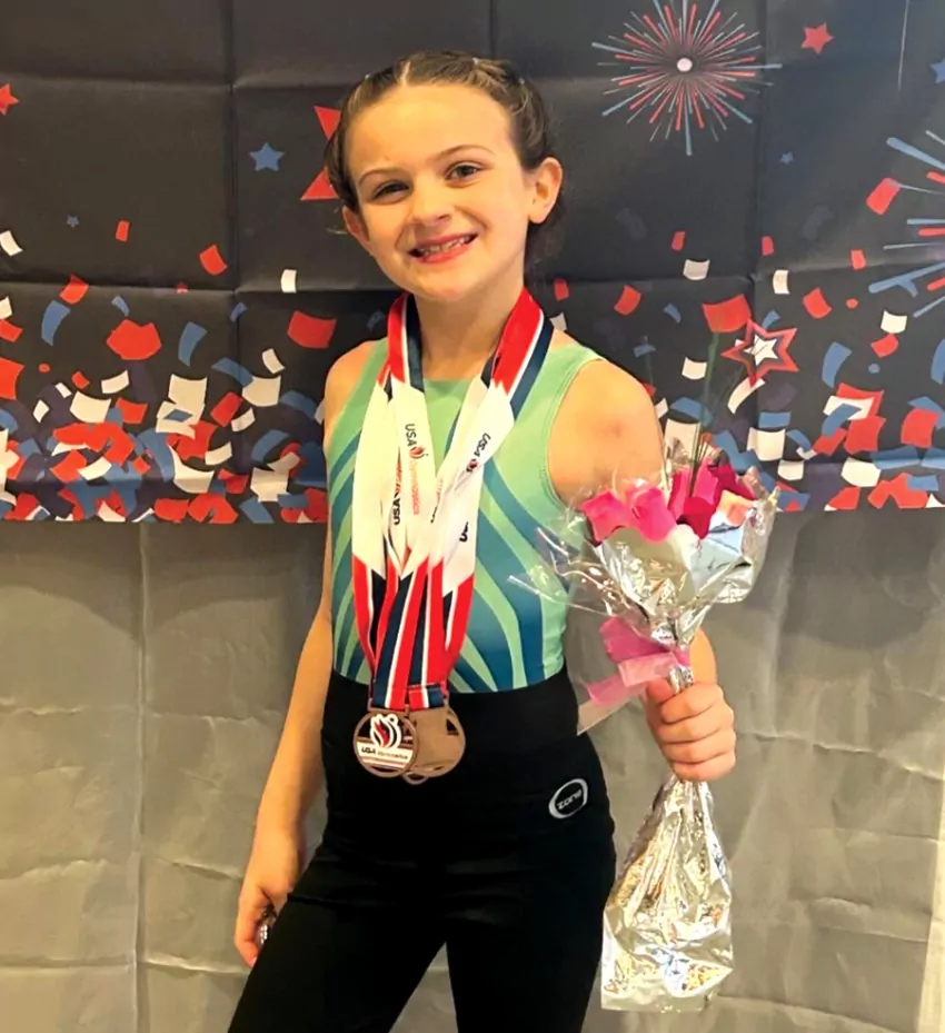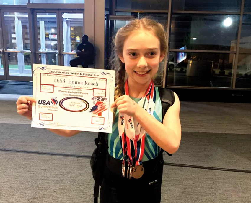Emma’s mom Callie reports: “Emma’s favorite event is the balance beam, where she scored a 9.3 at the State Championships in Jackson. She took home 4th place in the floor event and placed 6th in All-Around in her age division.”
