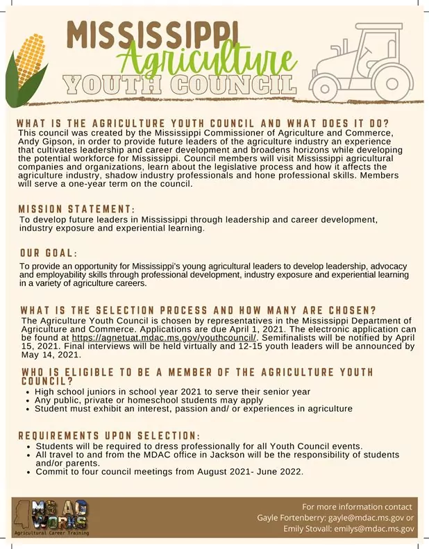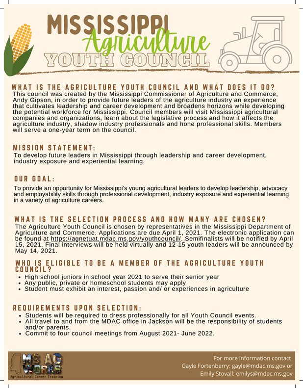 For more information about the Mississippi Agriculture Youth Council, visit www.mdac.ms.gov or contact Gayle Fortenberry at gayle@mdac.ms.gov or Emily Stovall at emilys@mdac.ms.gov.