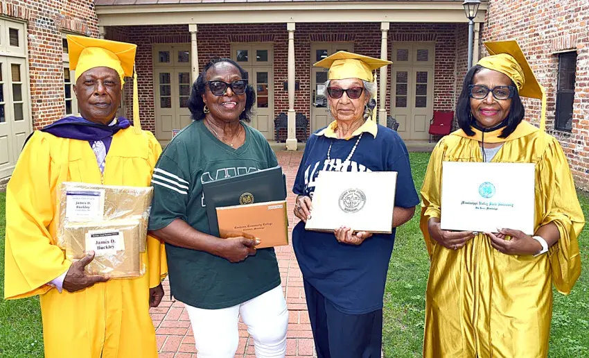 From left, James D. Buckley, Sevelda Taylor, Myrtle Houston Jordan and Eula Lang Johnson proudly display their “Golden Diplomas.” Buckley is a 1972 graduate of Coahoma Community College and a 1974 graduate of Alcorn State University. Taylor was graduated from Coahoma in 1966 and from Mississippi Valley State University in 1968, Jordan from Coahoma in 1965 and from Jackson State in 1967, and Johnson from Coahoma in 1973 and from MVSU in 2025. All four received education or related degrees and have a combined total of 173 years of service within the Tallahatchie County school systems: Buckley, 44 years in East Tallahatchie; Taylor, 41 years in East Tallahatchie; Jordan, 38 years in West Tallahatchie; and Johnson, 50 years in East Tallahatchie. (Photo by Clay McFerrin)