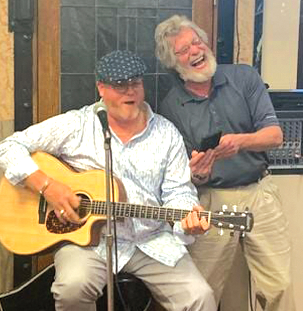 Musician Mark “Muleman” Massey, left, fulfills a request to sing “Ode to Billy Joe” while Ping Pong Paris assists with the lyrics. (Photo by Dana Clolinger)