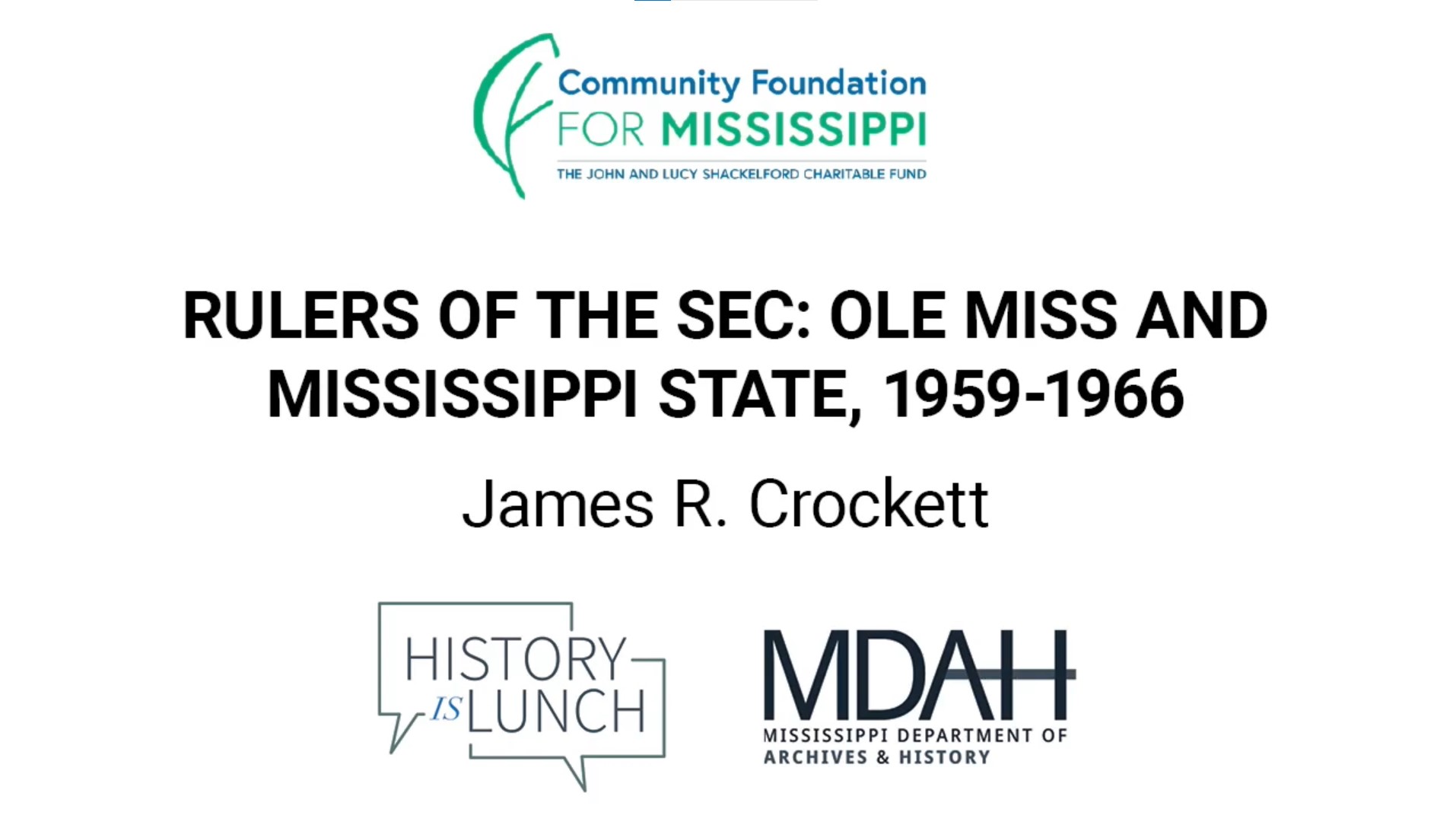 On September 1, 2021, James R. Crockett discussed his new book Rulers of the SEC: Ole Miss and Mississippi State, 1959-1966 as part of the History Is Lunch series.