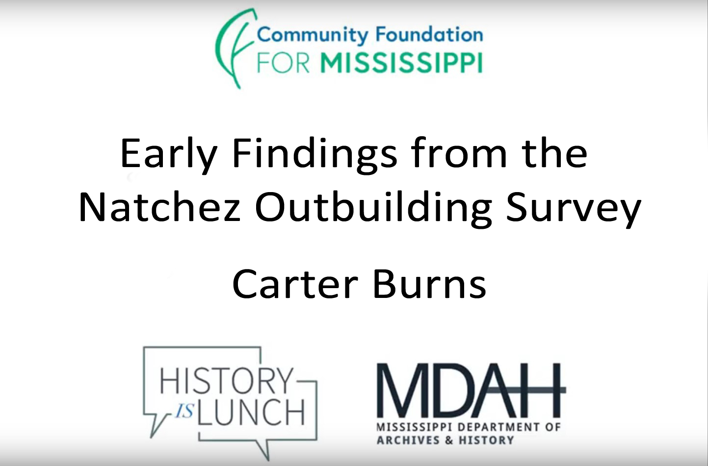 On May 12, 2021, Carter Burns presented “Early Findings from the Natchez Outbuilding Survey” as part of the History Is Lunch series.