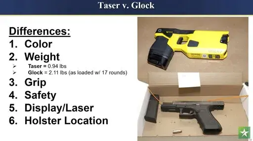 The Taser and gun also have different triggers, grips and safety mechanisms that must be engaged before firing, McGinnis testified. The Taser has a laser and LED lights that display before it is fired, which he demonstrated for the jury, while the handgun does not.