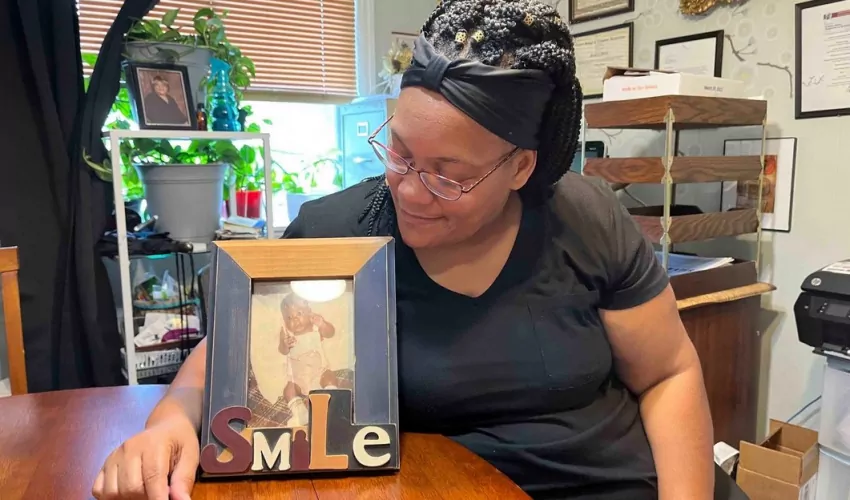 Sabrina Butler-Smith, 50, gazes at a photo of her infant son, Walter, who died on April 11, 1989, of polycystic kidney disease. Butler-Smith was convicted of killing and put on death row and finally exonerated fives years later following a retrial granted on appeal by the Mississippi Supreme Court. Katie Fogarty/MCIR