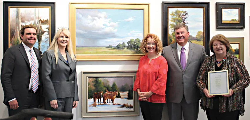 Works of Charleston artist Carol Roark, center, hang during a recent show at the Pacesetter Gallery in Flowood. Also pictured, from left, are Community Bank Chief Operating Officer Justin Martin, Pacesetter Gallery owner Keri Davis, Community Bank Executive Vice President of Corporate Operations Matt Mayo and poet Linda Owens. The bank has purchased some of Roark’s pieces. (Photo by Harris Elijah Yohanan)