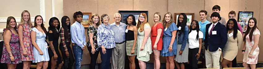 Pictured at the recent Ed and Becky Meek Foundation scholarship ceremony are, from left, recipients Sara Grace Wolfe, Shelby Boone, Libby Miller, Paris Holmes, DeShanelle Price and Jarvis Miller, Executive Director Meg Sinervo, Becky Meek, Ed Meek, and recipients Adrianna Flowers, Kendall Coker, Ava Ford, Breck Brewer, Aaliayah Bridges, Zyashanti Brooks, Josh Nelson, Houston Snyder, Barrett Stanford, Deja Walker, Jessie Willard, Elizabeth Willard. (Photo special to The Sun-Sentinel)
