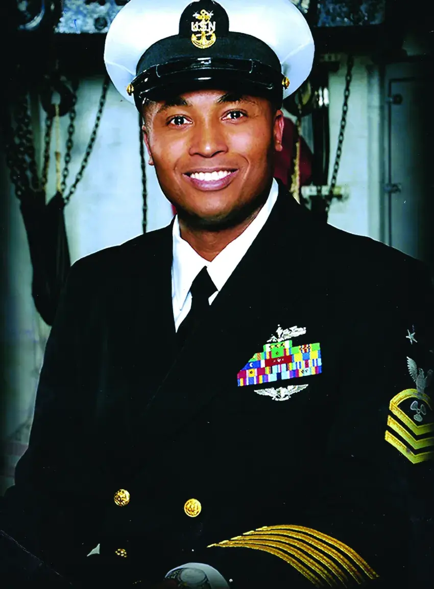 Former members of the USS Tallahatchie County pose in front of the Tallahatchie County Courthouse in Charleston with a ship silhouette crafted by a Charleston High School shop class. Gathered for the group’s final reunion on Sept. 14, 2024, are, from left, Dave Lang, Bruce Morgan, Len Lyons, Sam Markert, Duncan Crawford, Dennis Rawlins, Dave Callahan, Ron Shelton, Tim Wread, Ben Jones, Bill Beuke, Al Billings, Ed Cowan and John Greene. (Photo by Dana Clolinger)