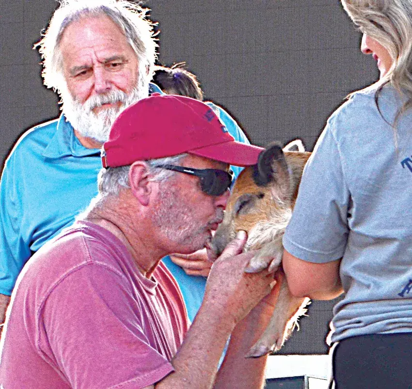 From left, CARE Executive Director Dana Clolinger, John Ball Burnett and Danny Adams look on as David Groner kisses "Miss Peaches" the pig, held by owner Laura Woods, on the Charleston Gateway to the Delta entertainment stage Saturday afternoon. (Copyright 2024 Emmerich Newspapers, Sun-Sentinel photo by Clay McFerrin)