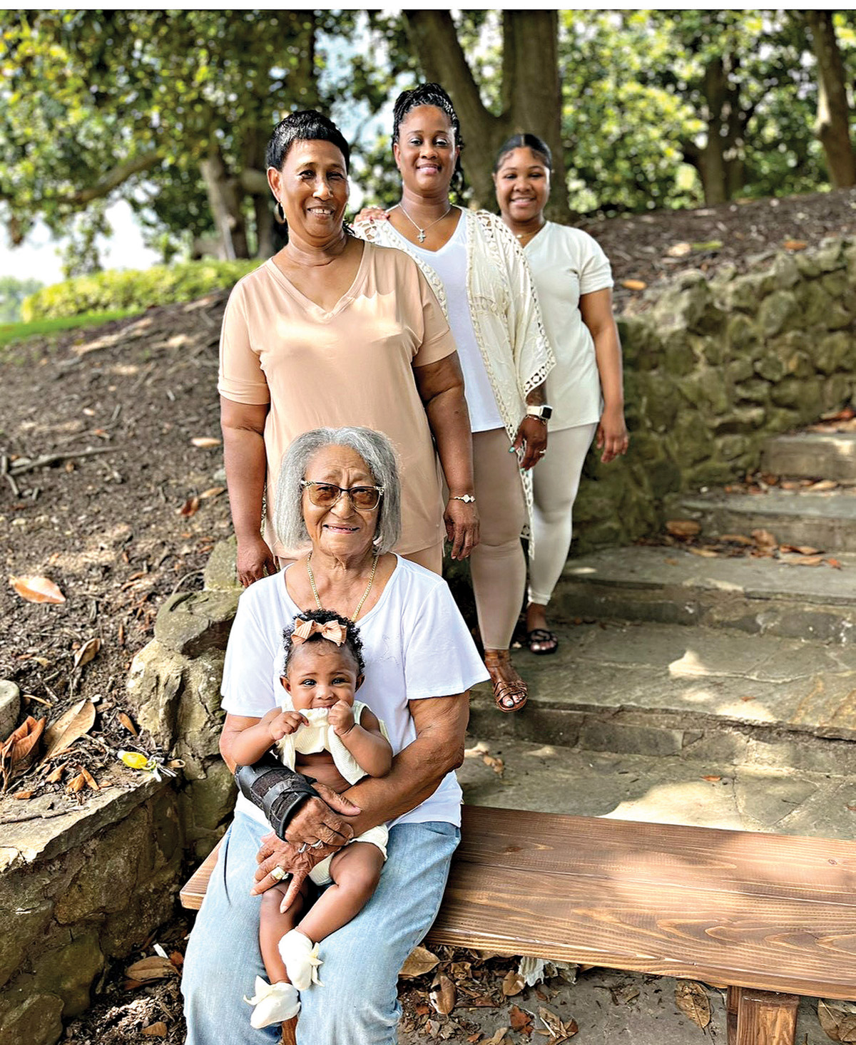 Dorothy Woodard, 86, of Charleston, is pictured with family members representing four other generations. She holds her great-great-granddaughter, 6-month-old Serenity Moore Street, of Memphis. Behind her, from bottom to top, stand her daughter, Cynthia Woodard, 65, of Scobey; her granddaughter, Lashonda Smith, 46, of Memphis; and her great-granddaughter, Latreasure Moore, 25, of Memphis. (Photo special to The Sun-Sentinel)
