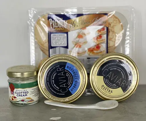 Speaking of caviar…. there are many kinds, from the extravagant to the affordable. You can serve it simply on some blini or little toasts with a dollop of crème fraiche or sour cream. Or dollop it on top of a simple pasta dish, or perhaps some scrambled eggs. Fulton Fish Market in New York City will ship directly to you; choices range from wild salmon roe at $20 a jar to Osetra (a lot more).