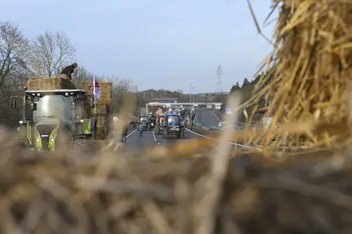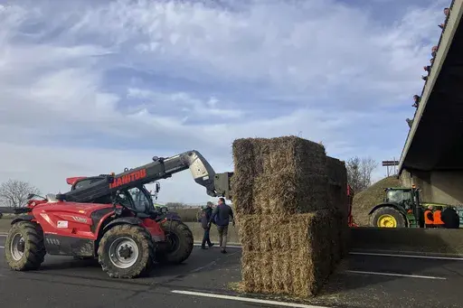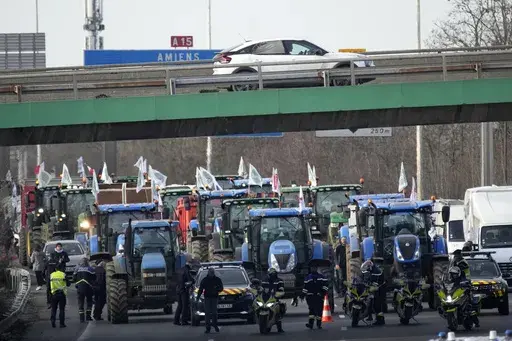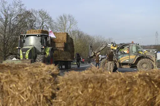 JOSSIGNY, France (AP) — Protesting farmers encircled Paris with traffic-snarling barricades Monday, using hundreds of lumbering tractors and mounds of hay bales to block highways leading to France's capital to pressure the government over the future of their industry, which has been shaken by repercussions of the Ukraine war.