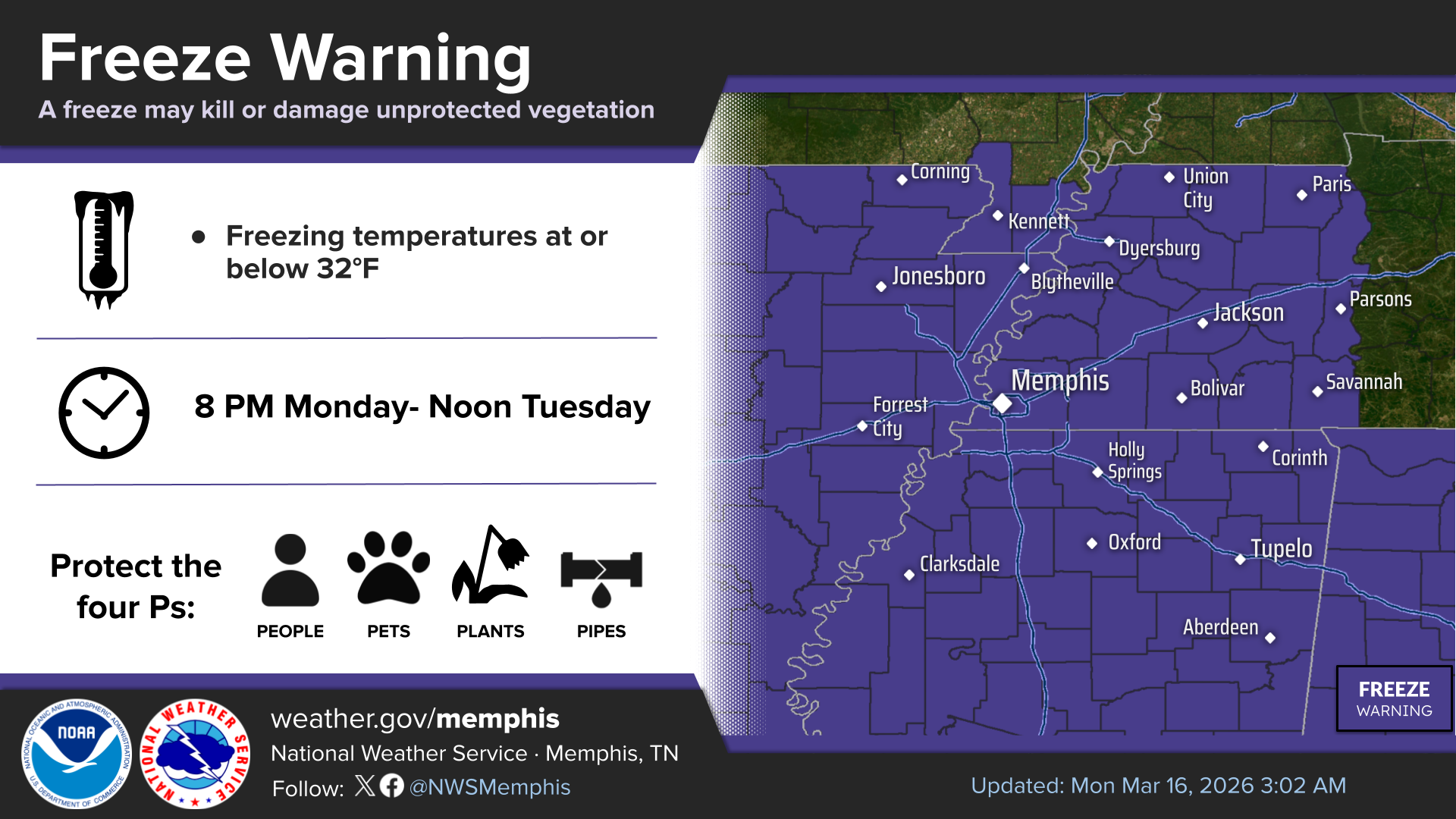 The National Weather Service has issued a Freeze Warning for Tallahatchie County and much of the rest of Mississippi and the Mid-South effective from 8 Monday night until noon on Tuesday.
