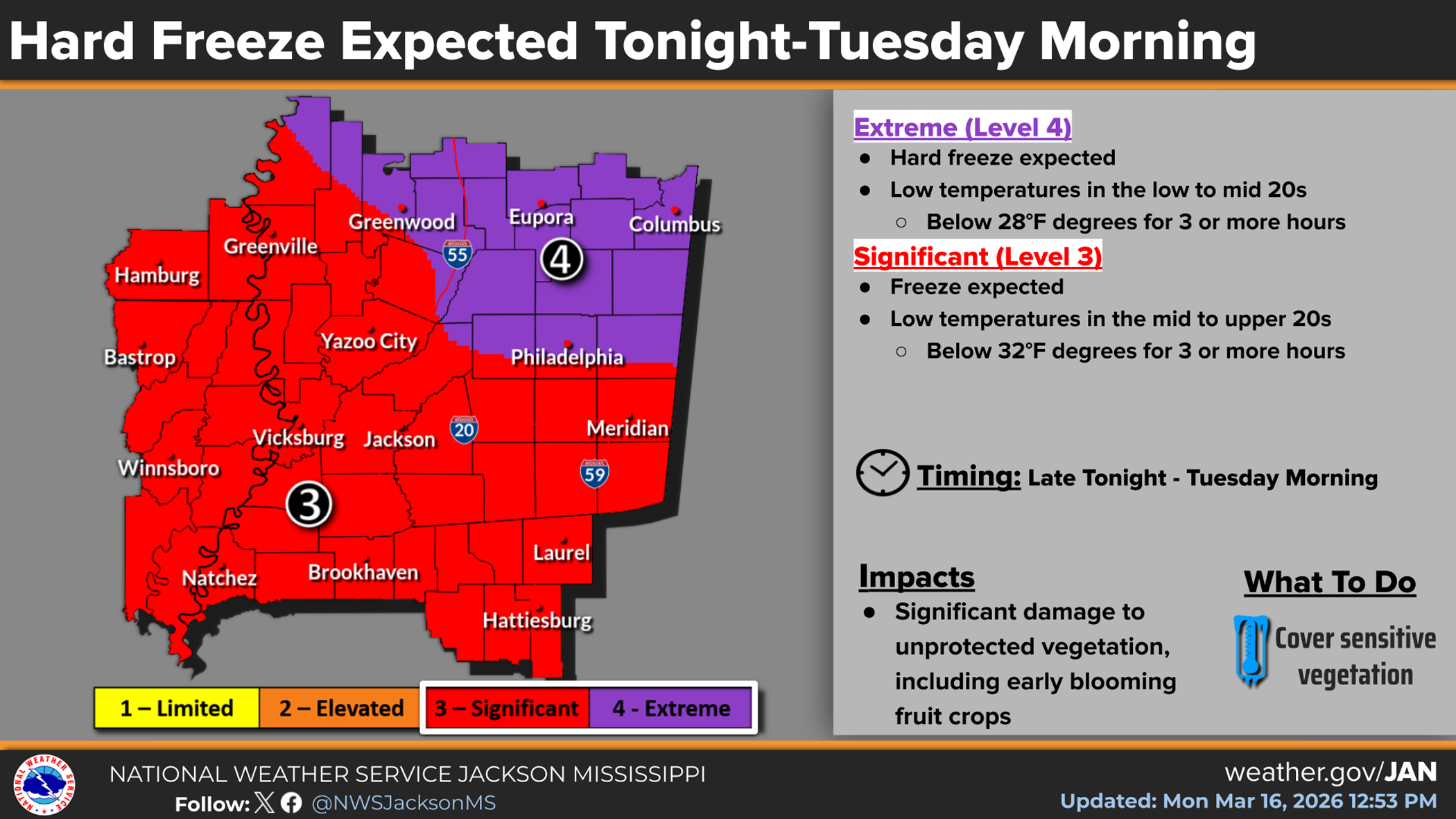 A National Weather Service map for the agency's Jackson service area shows that a hard freeze is expected tonight as far south as Greenwood and Philadelphia, while a significant freeze is expected for areas as far south as Brookhaven, Hattiesburg and Natchez.