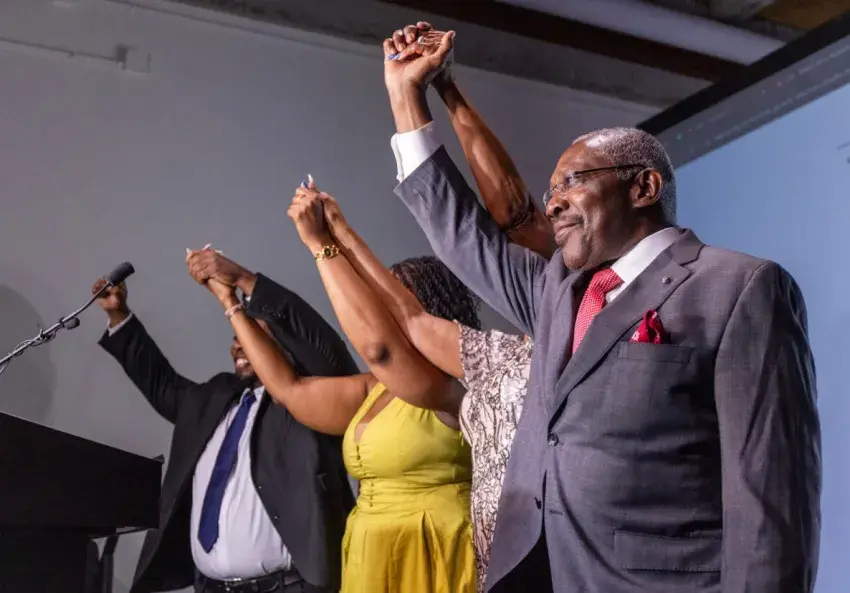 Mayoral candidate John Horhn is greeted by supporters as he arrives at his election night watch party at The Plant Venue, Tuesday, June 3, 2025, in Jackson, Miss. Horhn won the race for mayor. Credit: Eric Shelton/Mississippi Today