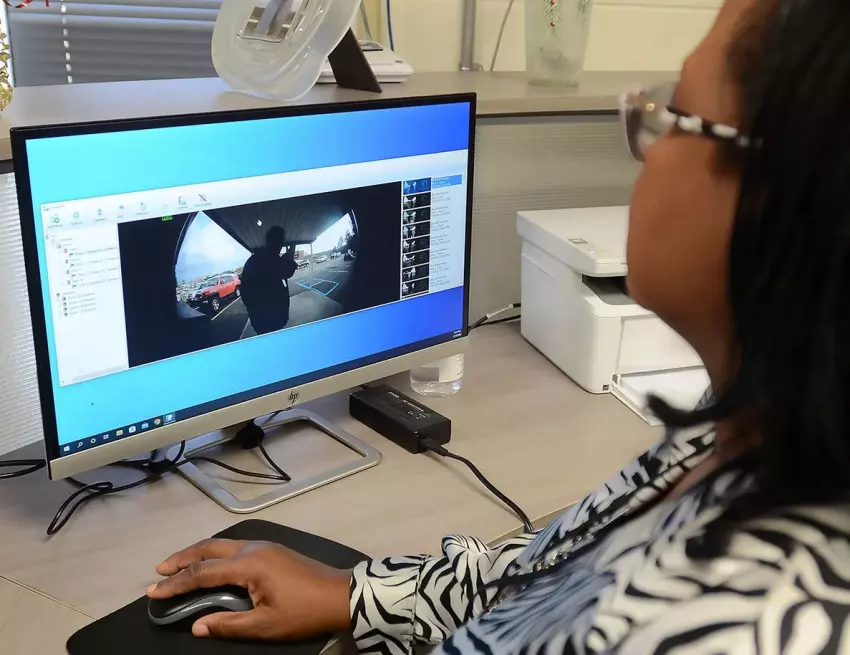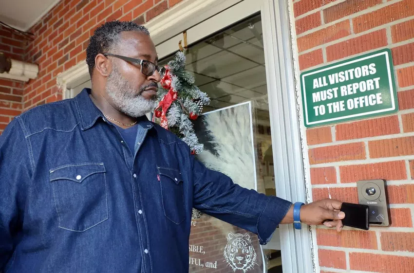 In Covington County, a federal grant allowed the district to install an access control system, which placed keycard locks on exterior doors, and cameras similar to Ring doorbells that secretaries can use to buzz in parents. Only staff have the keycards to open exterior doors from the outside, but a motion sensor on the inside of the door unlocks it for any person exiting.