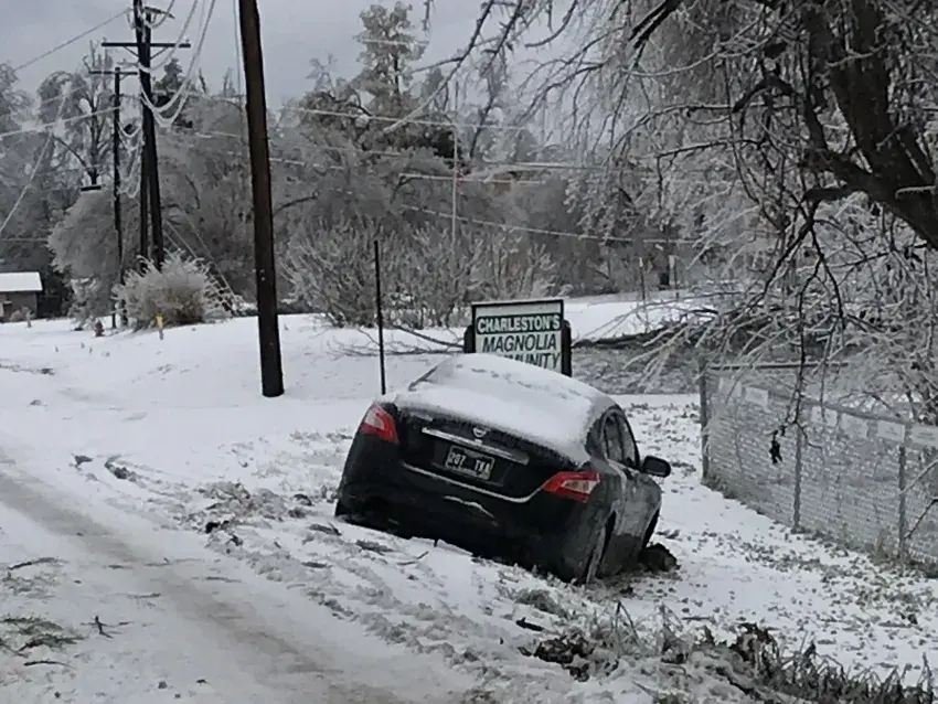 Several homes and automobiles were damaged by fallen trees. The weight of ice buildup on metal structures at the Teasdale and Vance firehouses caused partial roof collapse, inflicting damage to a pumper truck at Vance and a tanker truck at Teasdale. Several canopies around Charleston folded beneath the weight of ice, including one that covered the gas pump area at Mr. Jiffy convenience store.