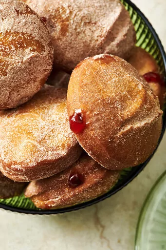 There are two ways to fill jelly doughnuts. You can fill them before frying (the jelly is sandwiched between two disks of yeast dough, sealed and fried). Or you can fry them first and then inject them with filling, which is what I do here. This technique removes the risk of not-properly-sealed doughnuts coming apart in the pan and leaking their filling.