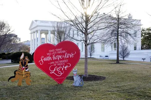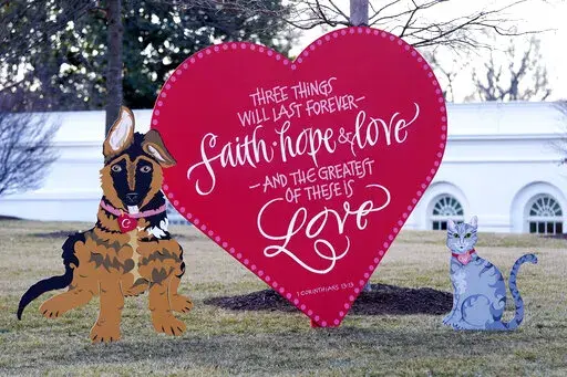 The first lady also took the group to the North Lawn to see her Valentine's Day installation: hand-painted, wooden artwork in the shapes of the Bidens’ puppy, Commander, and cat, Willow. There's also a separate heart-shaped cut-out inscribed with 1 Corinthians 13:13, “Three things will last forever — faith, hope and love — and the greatest of these is love.”