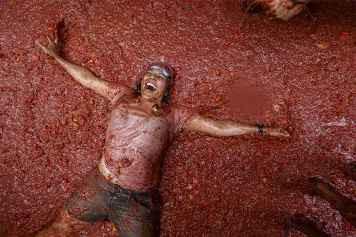 Patterns, blown kisses, celebrations of equality, ice skaters, the unself-conscious playing of children, a motorcycle riding against a dramatic sunrise, even a partier reveling in being immersed in a pool of squashed tomatoes — these images, gathered from all around the world, offer an antidote for much of the rest of 2024.