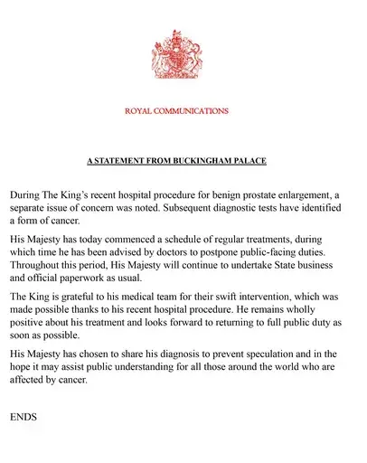 The palace added that the king "has chosen to share his diagnosis to prevent speculation and in the hope it may assist public understanding for all those around the world who are affected by cancer.”