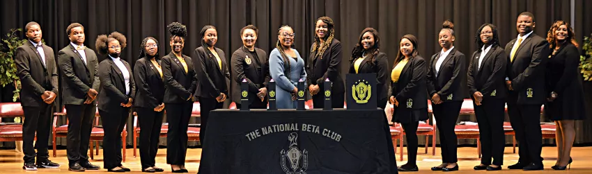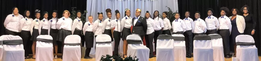 Pictured are West Tallahatchie Middle School JMG participants attending the recent initiation and installation ceremony held in the high school auditorium. From left, they are Nykenya Jones, Tadassah Green, Ky’Neesha Washington, Ky’Dresha Washington, Jamira Johnson, Leigh Hodges, Calmerious Green, Averie Hodges, Shaleyah Fairlee, Alyssa Hoskins, Reanna Lakes, Ja’Niya Moore, Ethan Collier, Brooklyn White, Tamiyra Jones, Aniya Hall, Joshua Wells, Althaveon Hoskins, Robert Jackson, Cordell Hooper, Cameron Christian, JMG Specialist Nedra Hollins and guest speaker, Dr. Pamela Confer. (Photo by Larry Gordon)