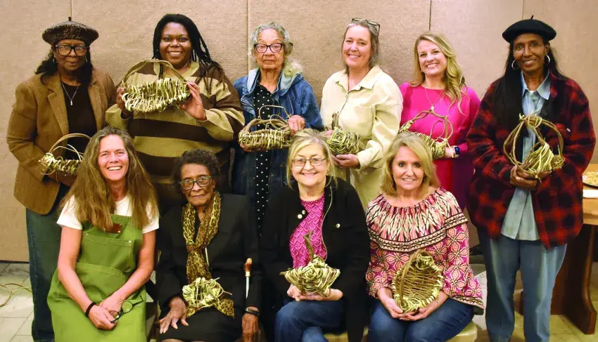 at CARE in Charleston on Sunday, Feb. 15. Attendees learned to weave kudzu vines into beautiful baskets. Seated, from left, are instructor Nancy Opalko, Doris Taylor, Lyn Hardy and Tammy Hayward. Standing, from left, are Patsy Thompson, Trish Hollis, Myrtle Jordan, Alanna Burns, Alisha Pittman and Vivian Townes. The class was funded by a grant from the Mississippi Presenters Network Artist Exchange Program. (Photo by Dana Clolinger)
