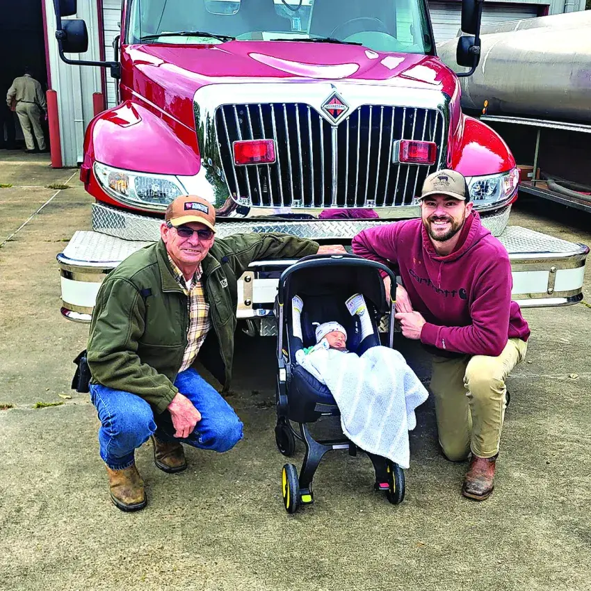 Oakland Fire Chief Rich Ross, left, was a teenager when he joined the department that his father helped organize in Oakland in the 1970s. Today, Rich’s son Bailey, right, is a firefighter and brought his 3-month-old son, Sadler, to the Appreciation Day activities in hopes of getting him started early in the volunteer process. (Photo by Linda Ross Aldy)