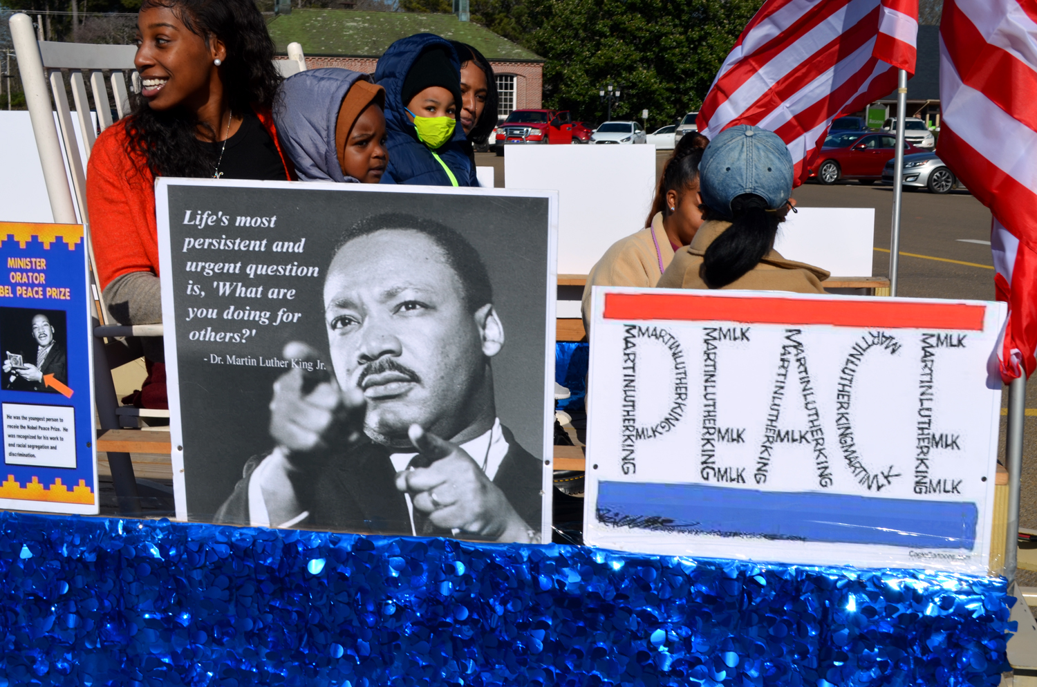 One of the entries in Monday's Martin Luther King Jr. Day parade in Charleston features numerous posters and graphics dedicated to the memory and the impact of Dr. King. (Photo by Clay McFerrin)