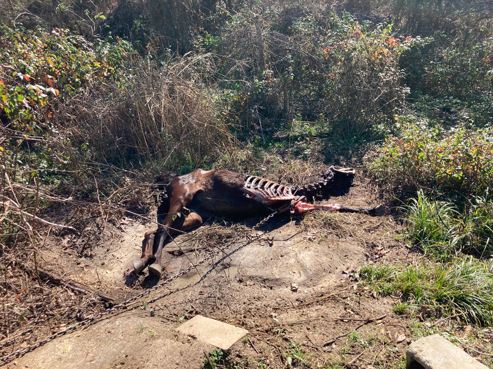 This horse, apparently starved to death and tethered by a chain, was found in the Enid community. (Photo by In Defense of Animals)