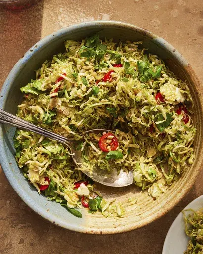 In this recipe from our cookbook “ Milk Street 365: The All-Purpose Cookbook for Every Day of the Year,” we massage shredded sprouts with rice vinegar and soy sauce, tenderizing the sprouts and tempering their cabbage-y qualities. The salt in the soy sauce draws out moisture while the massage breaks down the plant’s cell walls, rendering the firm, raw leaves supple and easy to chew.
