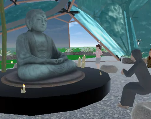 Students also created their own virtual sacred spaces. One team fashioned an island refuge where students, via their avatars, could silently contemplate a smiling, rotating Buddha statue. Another built a stone-like labyrinth leading to a place where sky and heaven seemed to merge.