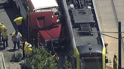 Dave Sotero, a spokesperson for LA Metro, said the bus crossed into the path of an E Line train. The light rail line runs from East Los Angeles to downtown Santa Monica mostly along streets, and not all of the crossings have gates.