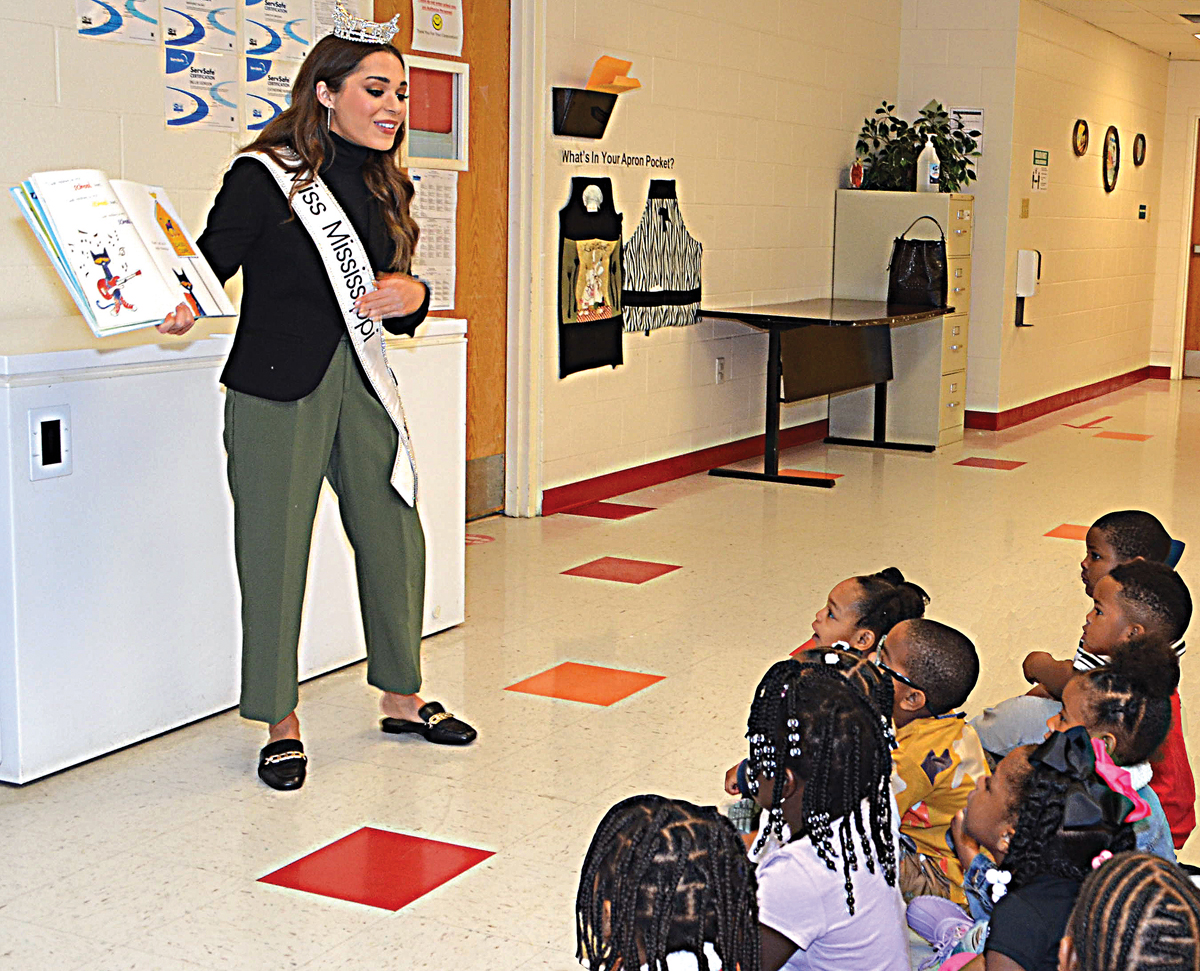 Miss Mississippi Emmie Perkins reads and, at intervals, sings from the book, “Pete the Cat: Rocking in my School Shoes,” to a group of pre-K students at the Eva Covington Head Start Center near Charleston. (Photo by Clay McFerrin)
