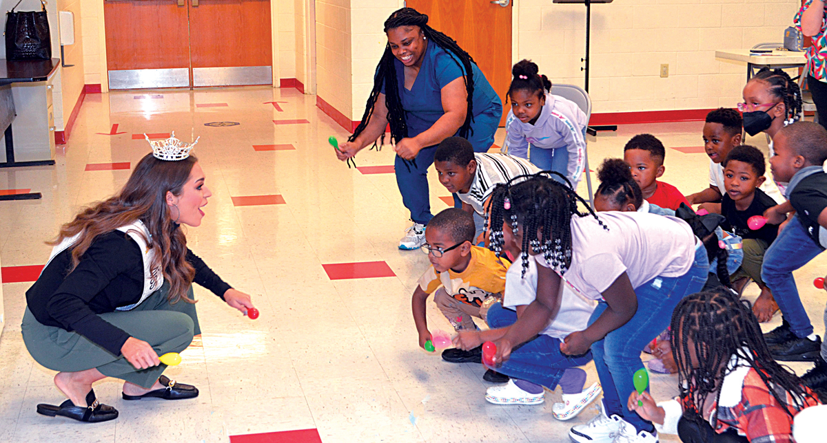 Miss Mississippi Emmie Perkins has pre-K students at the Eva Covington Head Start Center near Charleston shake maracas while going low and dancing to the Pharrell Williams song, “Happy.” (Photo by Clay McFerrin)