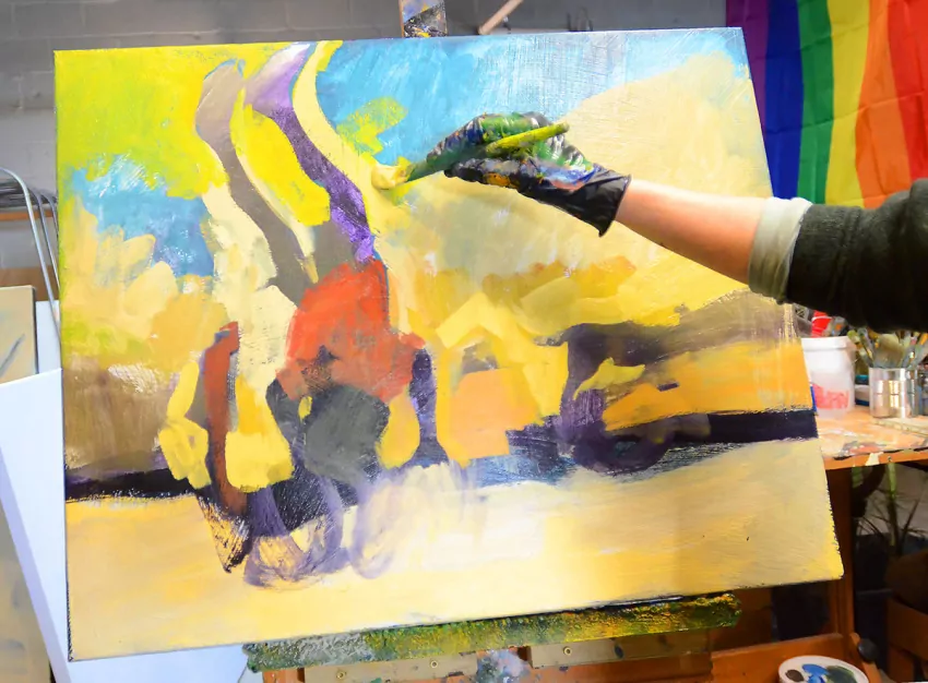 A palette knife replaces the gloved finger, adding a swoosh of another color.