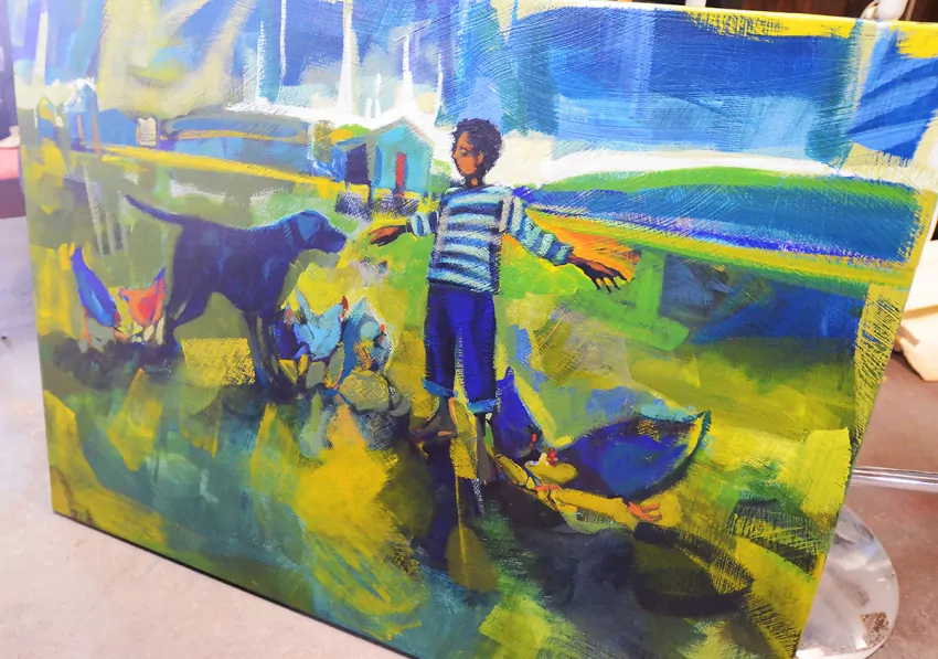 Her paintings set forever in time a simplicity often missed or taken for granted by the hustle and bustle of life — a silhouetted figure lost in somersaults, an angler with a dog enjoying a day of fishing or how colors combine to create the sun’s kiss making ordinary leaves extraordinary.