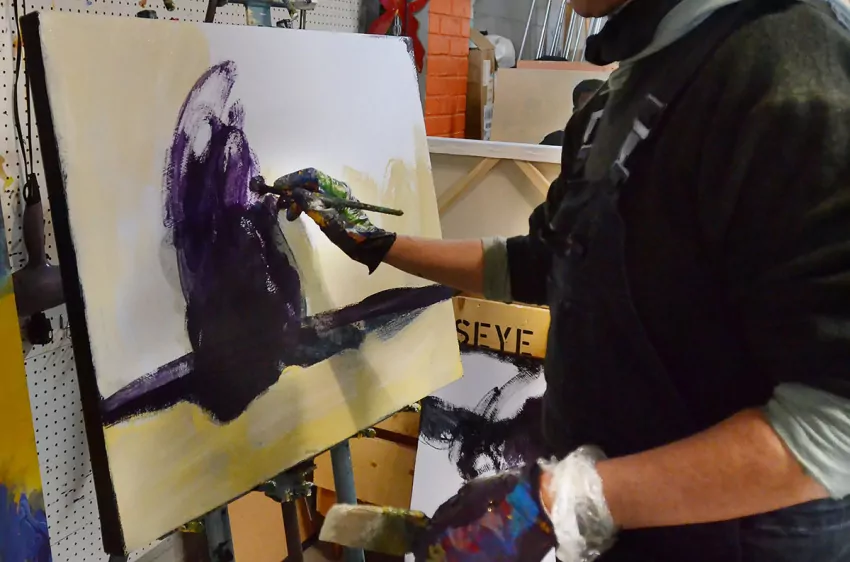 She stands for a moment with brush in hand, wearing paint-splattered coveralls, scrutinizing three paintings in progress. Then, she begins again, on all three.